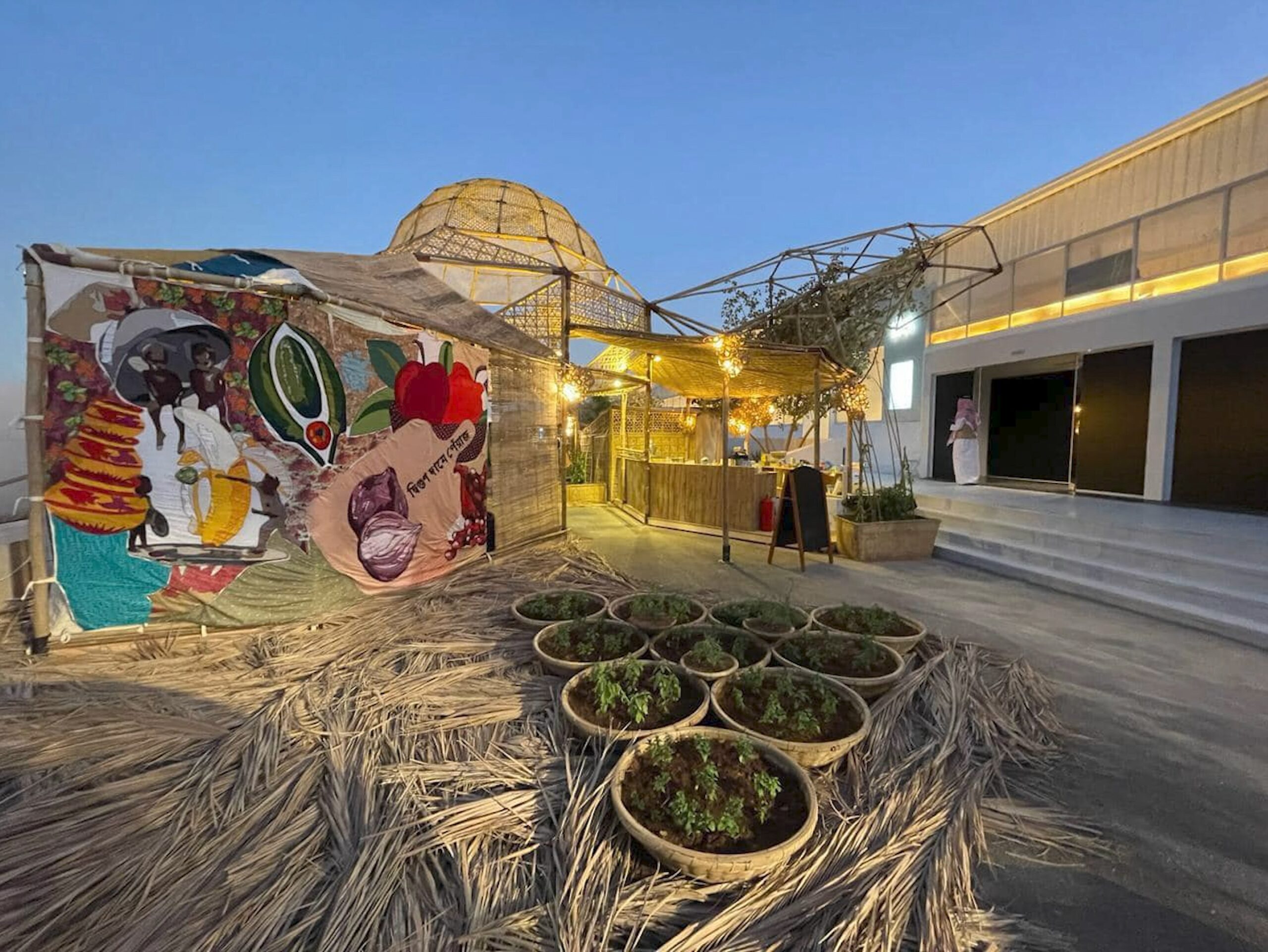 Ce projet a été présenté dans le cadre d’After Rain, 2024 Diriyah Contemporary Art Biennale, où les artistes ont accueilli les visiteurs dans un espace écologique, social et diasporique défini par les structures du palan et du pakghor bengalis. Le palan, jardin potager traditionnel généralement entretenu par les femmes et les enfants, alimente le pakghor, cuisine familiale ressemblant à une salle de séjour.
